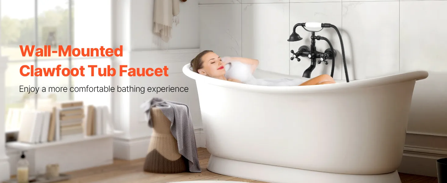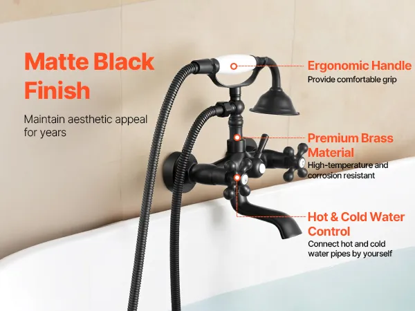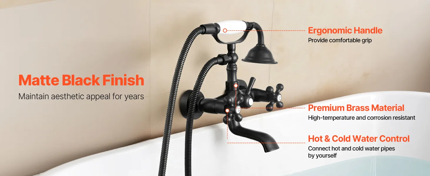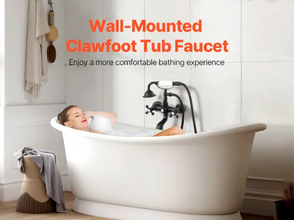 Elegancka i trwała: bateria wannowa VEVOR z nóżkami pazurowymi wykonana jest z litego mosiądzu z matowoczarnym wykończeniem i jest odporna na korozję. Dzięki klasycznemu, stylowemu wzornictwu, równemu przepływowi wody i elastycznej regulacji temperatury zapewnia komfort kąpieli, jednocześnie podkreślając wystrój łazienki.