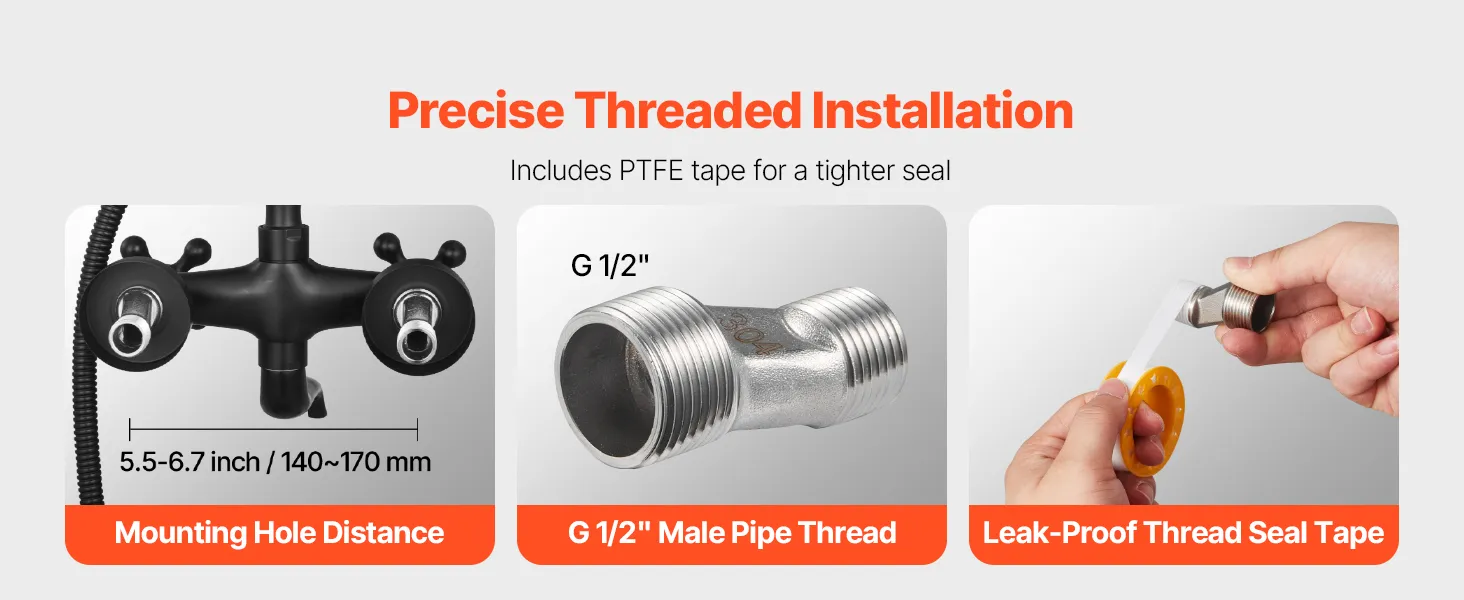 Precyzyjna konstrukcja gwintu z dołączoną taśmą PTFE zapewnia szczelniejsze i szczelne uszczelnienie. Łatwy montaż dzięki gwintowi zewnętrznemu G 1/2" i regulowanym ramionom obrotowym z rozstawem otworów montażowych 140–170 mm.