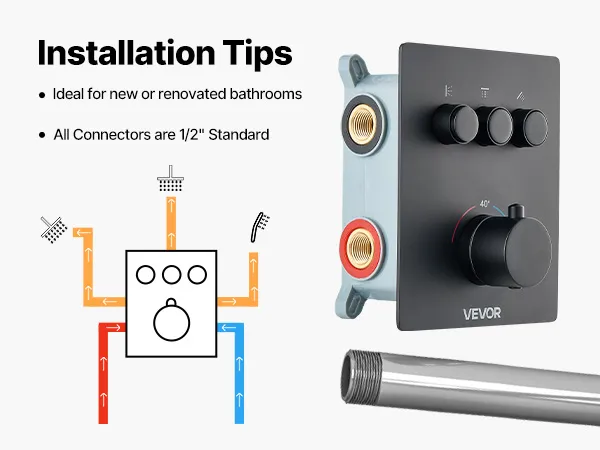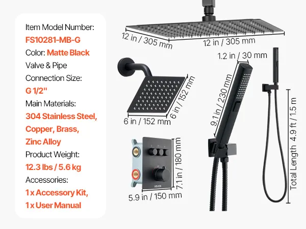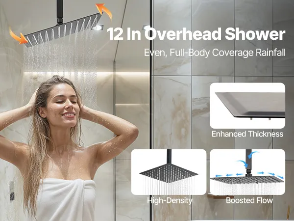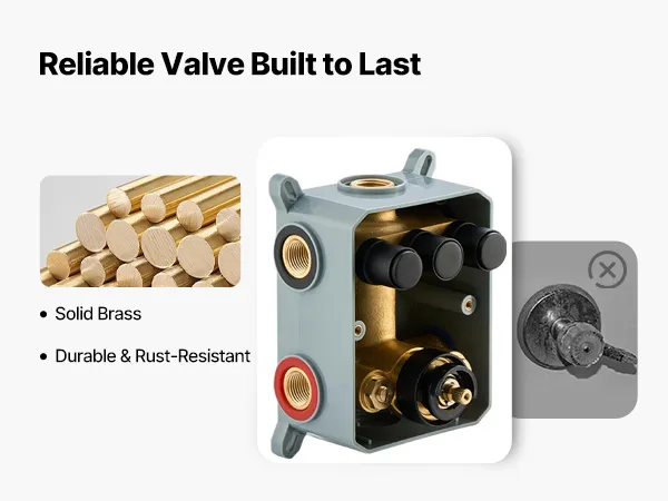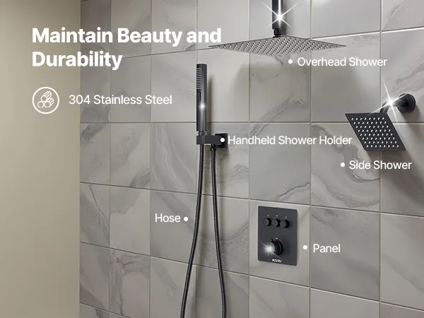 Łatwa konserwacja: System prysznicowy wyposażony jest w solidny mosiężny zawór i ceramiczną głowicę termostatyczną, co zapewnia trwałość i szczelność. Płyta ze stali nierdzewnej 304 dodaje elegancji, a elastyczne silikonowe dysze usuwają osady kamienia.