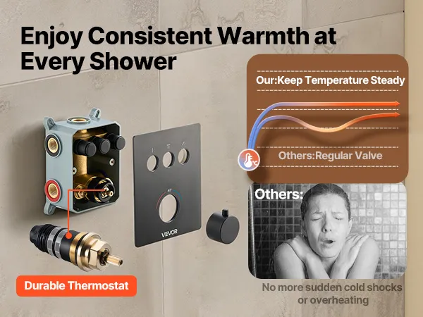 Termostat zabezpieczający przed oparzeniem: Ten system prysznicowy wyposażony jest w precyzyjny zawór termostatyczny. Zapewnia on stałą i bezpieczną temperaturę wody przez cały czas trwania prysznica.