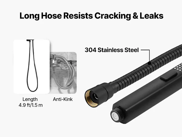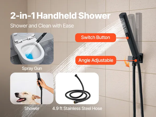 Prysznic ręczny 2 w 1: Element naszego systemu prysznicowego z funkcją natrysku i natrysku. Strumień wody pod ciśnieniem spłukuje ściany i wanny, a następnie automatycznie powraca do trybu natrysku, aby zapobiec wypadkom. Wąż o długości 1,5 m (4,9 stopy) i obrotowy uchwyt umożliwiają czyszczenie pod różnymi kątami.