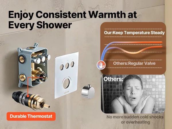 Termostat zabezpieczający przed oparzeniem: Ten system prysznicowy wyposażony jest w precyzyjny zawór termostatyczny. Zapewnia on stałą i bezpieczną temperaturę wody przez cały czas trwania prysznica.