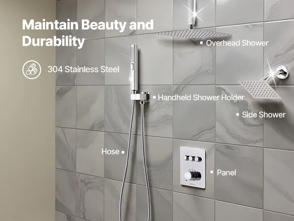 Łatwa konserwacja: System prysznicowy wyposażony jest w solidny mosiężny zawór i ceramiczną głowicę termostatyczną, co zapewnia trwałość i szczelność. Płyta ze stali nierdzewnej 304 dodaje elegancji, a elastyczne silikonowe dysze usuwają kamień.