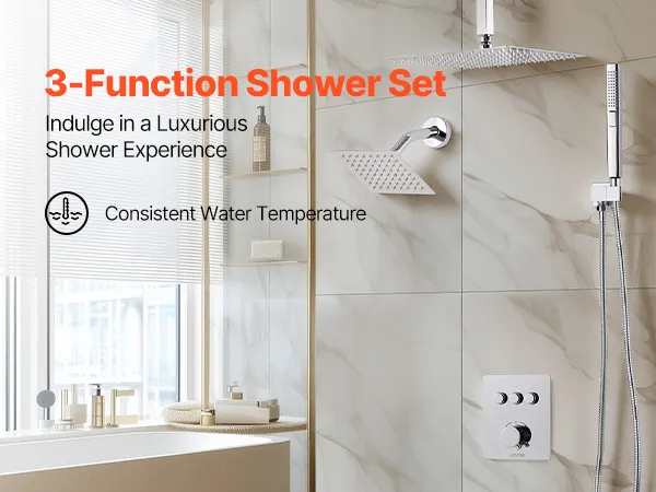 3-funkcyjny system prysznicowy: Nasz zestaw baterii prysznicowej zawiera rączkę prysznicową z dwoma ustawieniami, prysznic boczny i deszczownicę. Trzy niezależne przyciski i pokrętło umożliwiają regulację przepływu i temperatury wody. Ukryta rura nadaje nowoczesny styl.