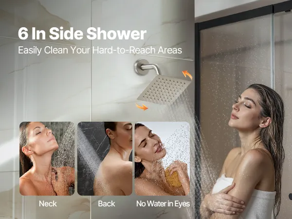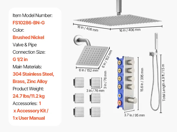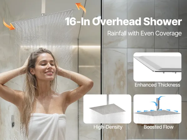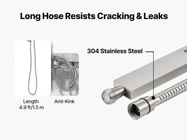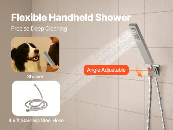 Dokładne czyszczenie: Ten system natrysku deszczowego zawiera 16-calowy prysznic górny i 6-calowy prysznic boczny z regulowanym kątem nachylenia. Mieszanka powietrza i wody tworzy strumień przypominający deszcz, a ręczna głowica prysznicowa z wężem o długości 4,9 stopy (ok. 1,5 m) i obrotowym uchwytem umożliwia czyszczenie pod różnymi kątami.