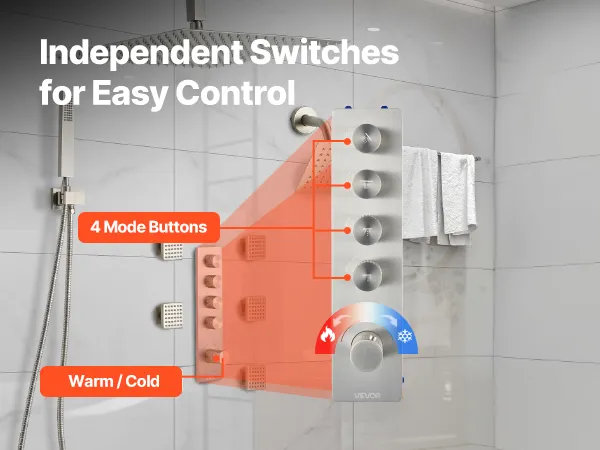 4-funkcyjny system prysznicowy: Nasz zestaw baterii prysznicowej zawiera sześć strumieni bocznych, deszczownicę, prysznic boczny i rączkę prysznicową. Cztery niezależne pokrętła i przełącznik umożliwiają regulację przepływu i temperatury wody. Ukryta rura nadaje nowoczesny styl.
