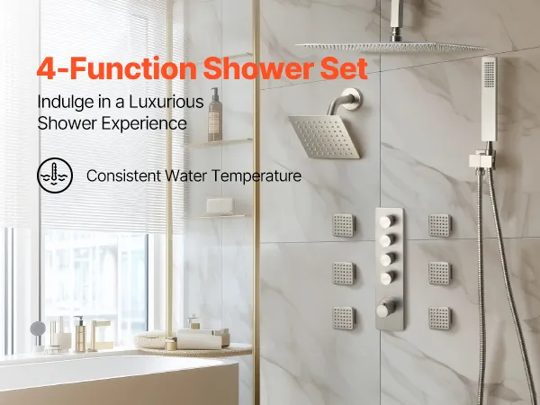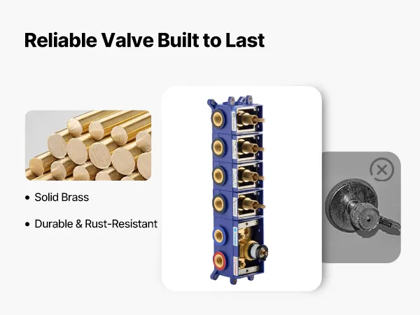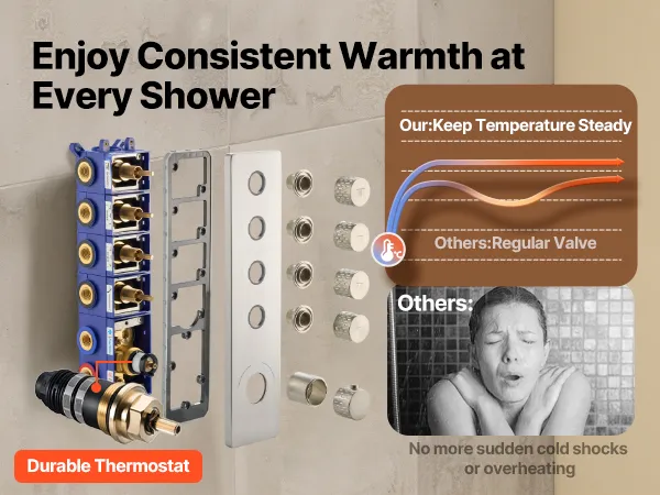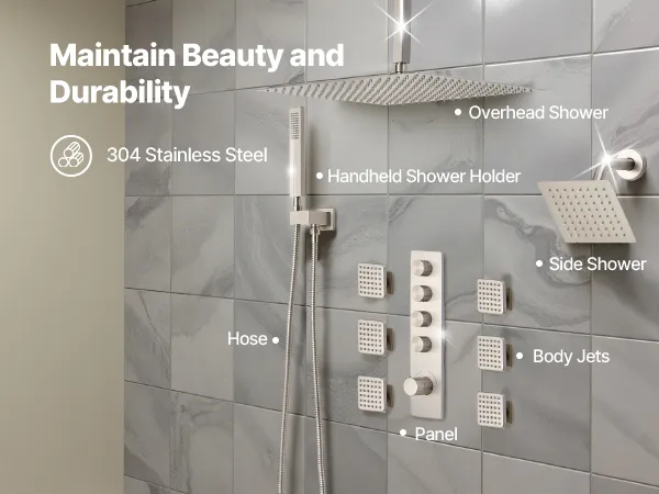 Łatwa konserwacja: System prysznicowy wyposażony jest w solidny mosiężny zawór i ceramiczną głowicę termostatyczną, co zapewnia trwałość i szczelność. Płyta ze stali nierdzewnej 304 dodaje elegancji, a elastyczne silikonowe dysze usuwają kamień.