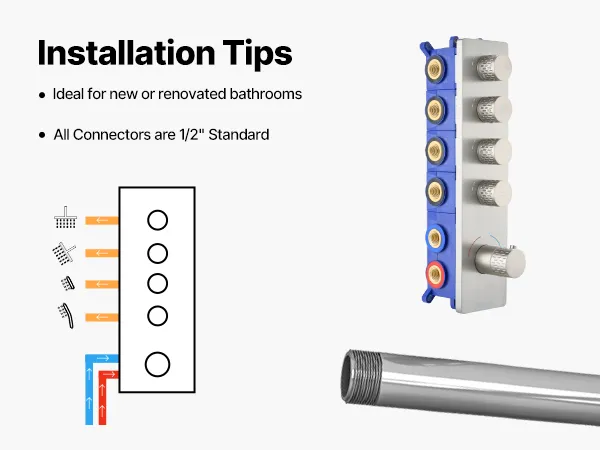 Nasz zestaw prysznicowy ukrywa instalację hydrauliczną za ścianą, tworząc elegancki, luksusowy wygląd łazienki. Zawiera cztery odświeżające funkcje prysznicowe – sześć strumieni natrysku, prysznic górny, prysznic boczny i prysznic ręczny – dla lepszego doznania kąpieli całego ciała.