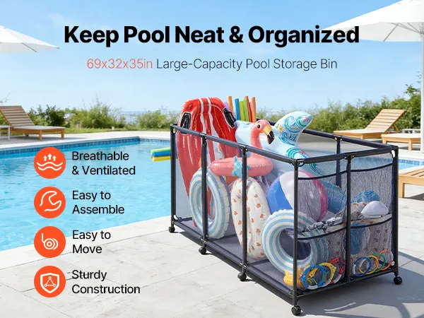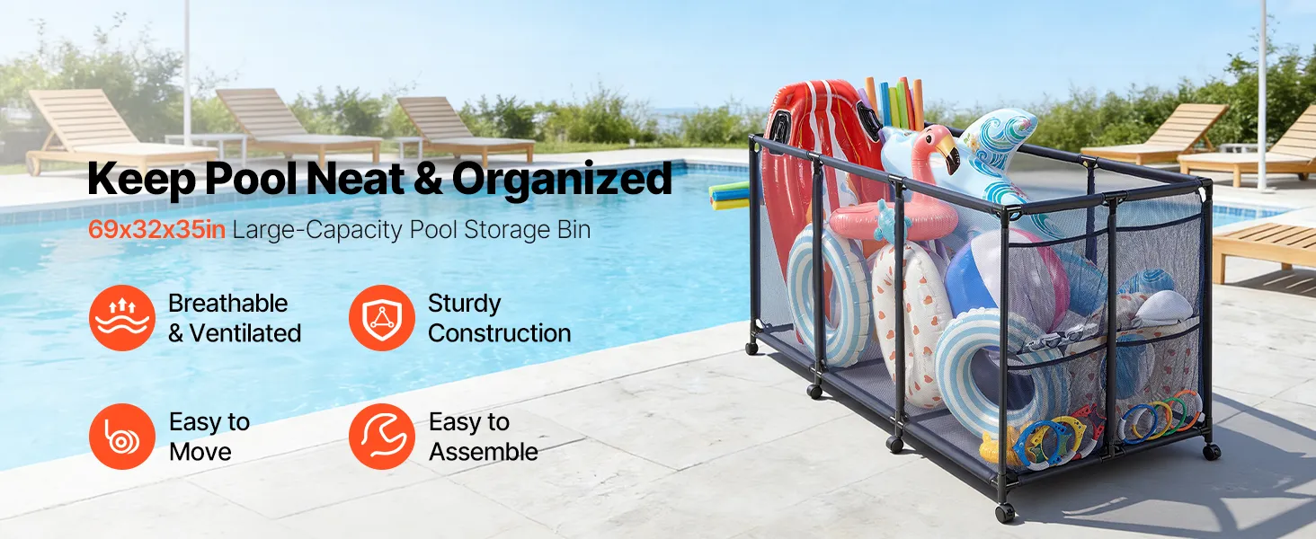 Large-Capacity Storage: The pool storage bin holds water balls, surfboards, foam floats, pool noodles, swim rings, and more. A side pocket keeps goggles and swim caps within reach, while the pool noodle holder stores pool noodles neatly for a organized poolside
