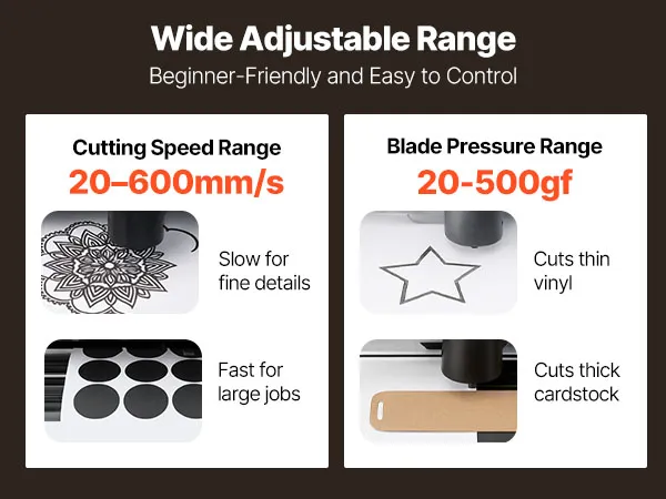 Wszechstronność materiałów: Ten ploter winylowy obsługuje arkusze i rolki o grubości do 1 mm i posiada regulowany nacisk w zakresie 20–500 gf. Z łatwością przetwarza winyl, HTV, winyl samoprzylepny, arkusze magnetyczne, papier samoprzylepny, naklejki samochodowe i wiele innych materiałów do projektów DIY i komercyjnych.
