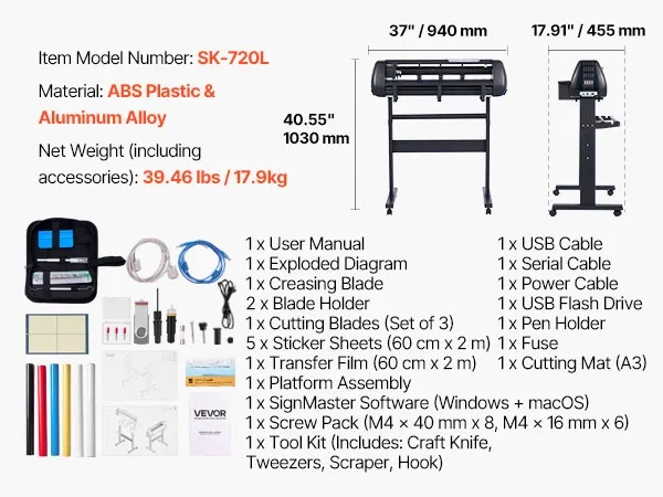 Maszyna do cięcia winylu VEVOR z maks. szerokością podawania 72 cm, podwójnymi ostrzami i wyświetlaczem LED, regulowanym ploterem tnącym do winylu z arkuszami naklejek i foliami transferowymi oraz oprogramowaniem Signmaster