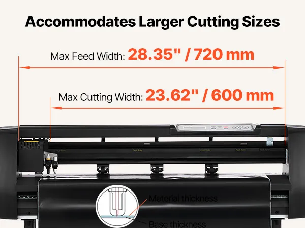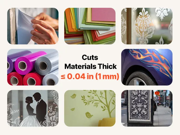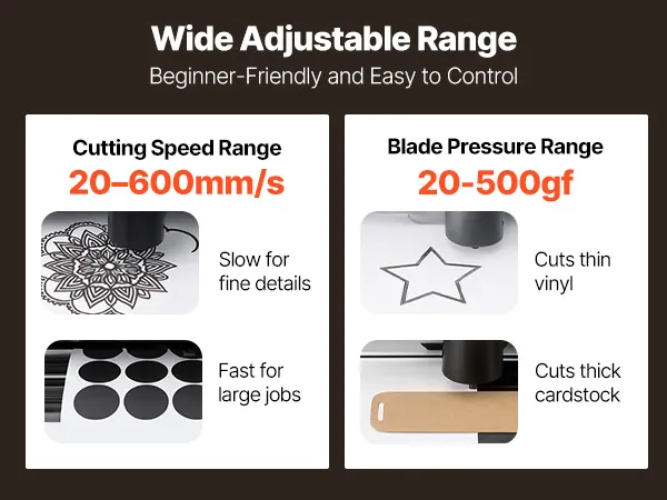 Wszechstronny materiał: Ten ploter winylowy przetwarza arkusze i rolki o grubości do 1 mm i posiada regulowany nacisk w zakresie 20–500 gf. Z łatwością przetwarza winyl, HTV, winyl samoprzylepny, folie magnetyczne, papier samoprzylepny, naklejki samochodowe i wiele innych materiałów do projektów DIY i komercyjnych.