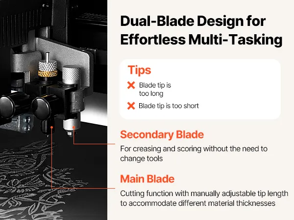 Konstrukcja z dwoma ostrzami: Nasz ploter tnący do winylu jest wyposażony w ostrza główne i pomocnicze, co pozwala na jednoczesne rysowanie, cięcie i bigowanie. Ręczna wymiana ostrzy nie jest wymagana; wiele procesów można wykonać za jednym razem, co znacznie zwiększa wydajność pracy.