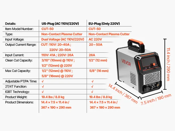 Mocne cięcie: Ta przecinarka plazmowa VEVOR generuje maksymalny prąd wyjściowy 50 A i oferuje wysoką wydajność cięcia. Umożliwia czyste cięcie do 12 mm i maksymalną grubość cięcia 16 mm. (Uwaga: tylko 220 V. Zasilacz nie jest dołączony.)
