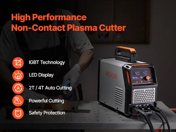 Przecinarka plazmowa VEVOR, bezkontaktowa maszyna do cięcia plazmowego z łukiem pilotującym o natężeniu 50 A, falownik IGBT z wyświetlaczem cyfrowym, funkcją 2T/4T i regulowanym czasem PA/PT do napraw domowych i warsztatów