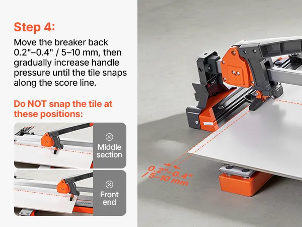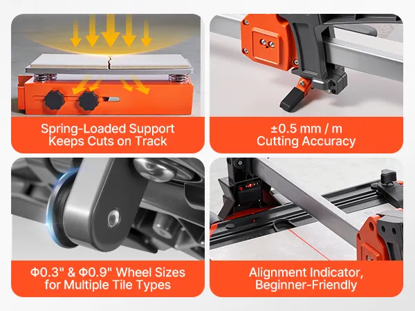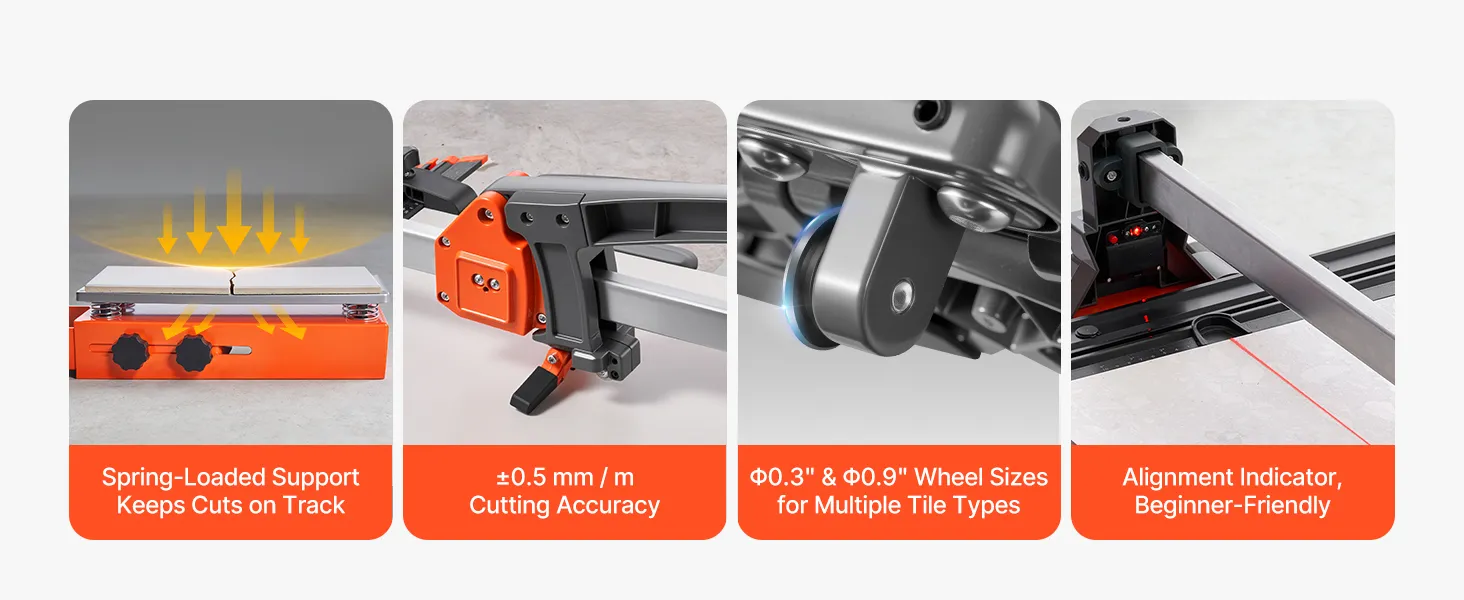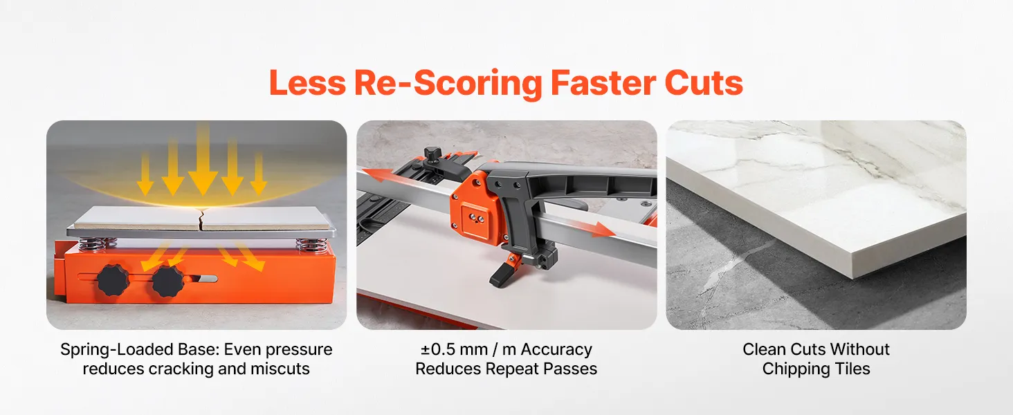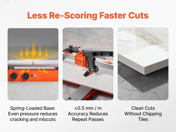Podstawa sprężynowa: Ta przecinarka do płytek została zaprojektowana do częstego użytku i wyposażona jest w podstawę sprężynową, która stabilizuje płytki podczas nacinania i łamania, równomiernie rozprowadza nacisk i zmniejsza powstawanie pęknięć, zwłaszcza na nierównych lub teksturowanych powierzchniach płytek.