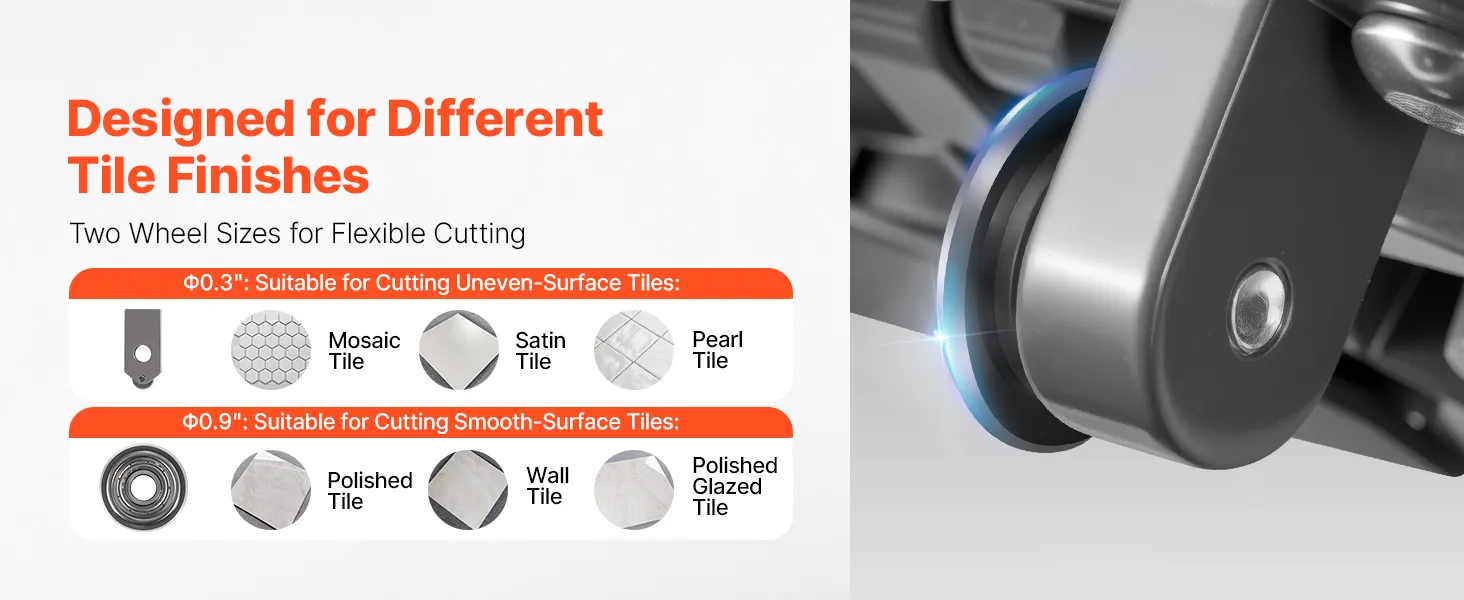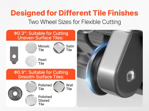 W zestawie dwa rozmiary tarcz: Dwie wymienne tarcze tnące umożliwiają zarówno cięcie drobne, jak i grube. Tarcza o średnicy 7,62 mm (0,3 cala) nadaje się do płytek mozaikowych i teksturowanych, natomiast tarcza o średnicy 22,86 mm (0,9 cala) idealnie nadaje się do płytek gładkich i polerowanych.