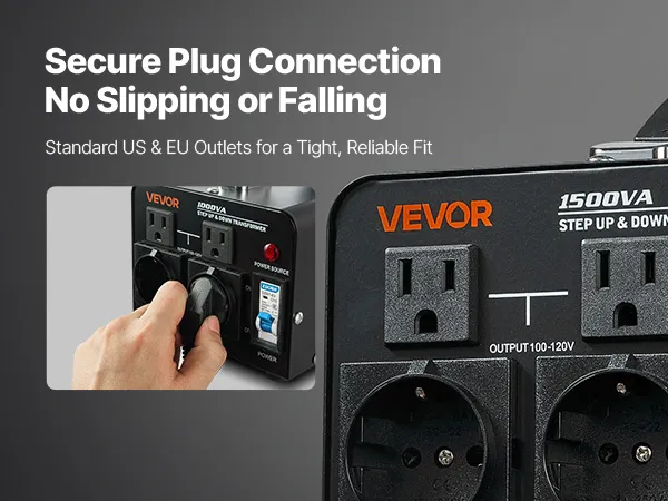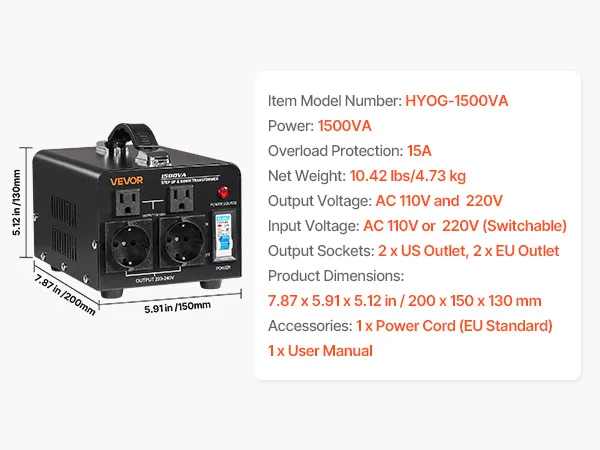 Transformator napięcia VEVOR, transformator mocy podwyższający/obniżający napięcie 1500 VA, konwertuje napięcie z 110 V na 220 V i z 220 V na 110 V, z gniazdami amerykańskimi i europejskimi, przewodem zasilającym i wyłącznikiem automatycznym
