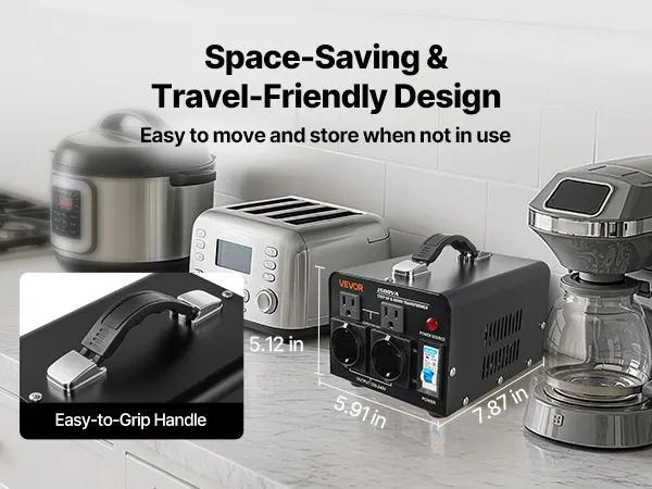 Kompaktowy rozmiar, niezwykła wygoda: Kompaktowa obudowa zajmuje niewiele miejsca, a uchwyt na górze ułatwia transport w domu lub w podróży. Czy to w domu, czy w podróży, nasz transformator podwyższający/obniżający napięcie zasili Twoje urządzenia elektroniczne w dowolnym miejscu.