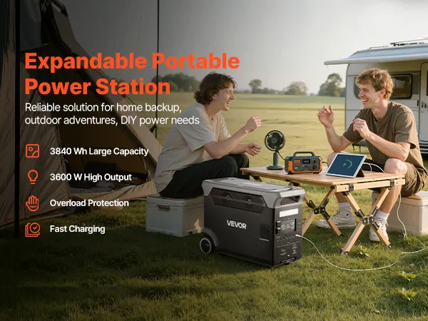 VEVOR 3600W portable power station is your reliable power solution on the go. With 10 output ports, 3840Wh high-capacity LiFePO₄ battery, expandable capacity, and versatile charging options, it provides continuous and dependable power. Perfect for camping, outdoor gatherings, and family trips.