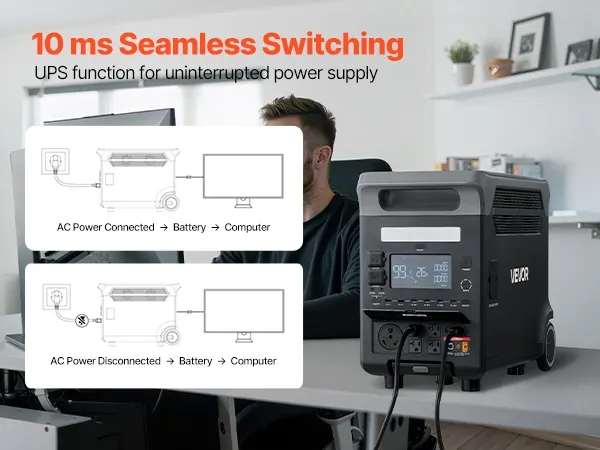 With a built-in UPS function, the power station solar generator automatically switches to battery power within 10 ms during outages, keeping computers, routers, and other critical devices running without data loss or interruptions.