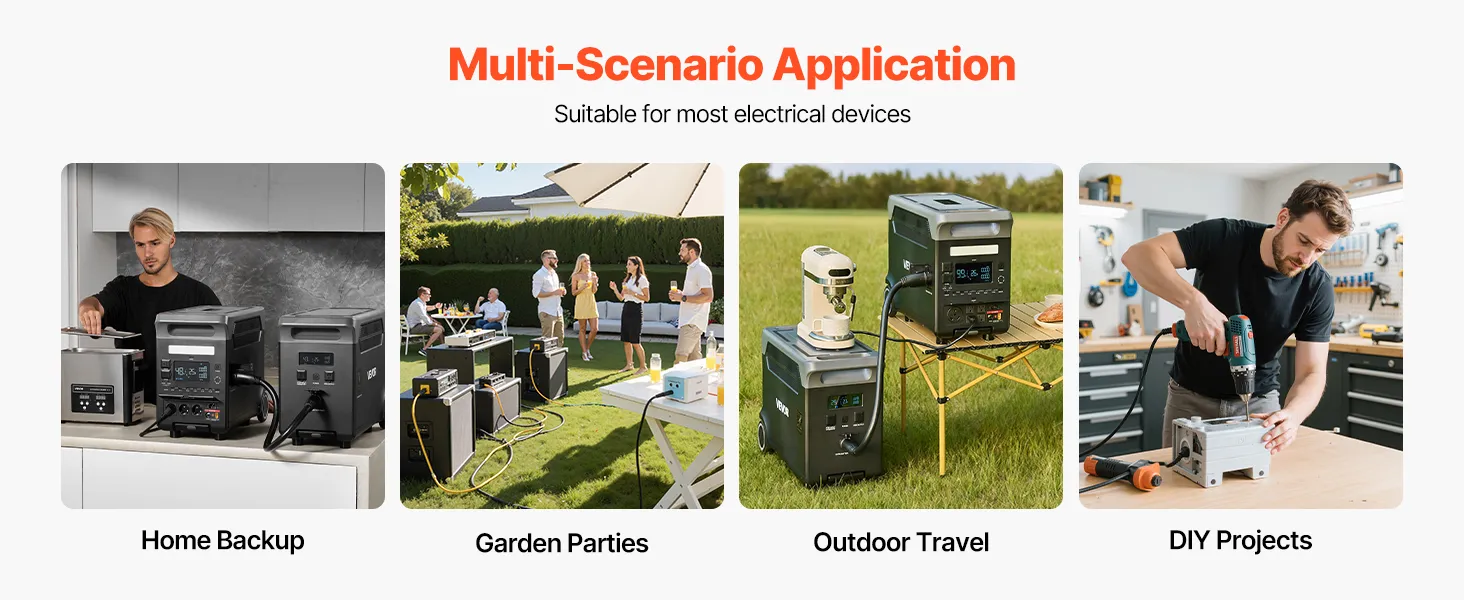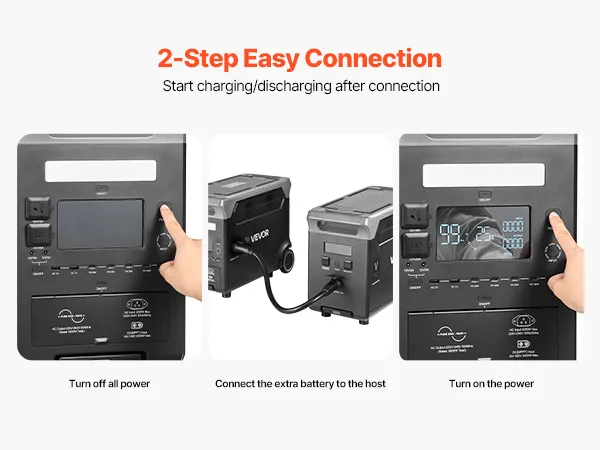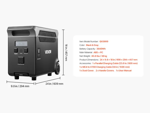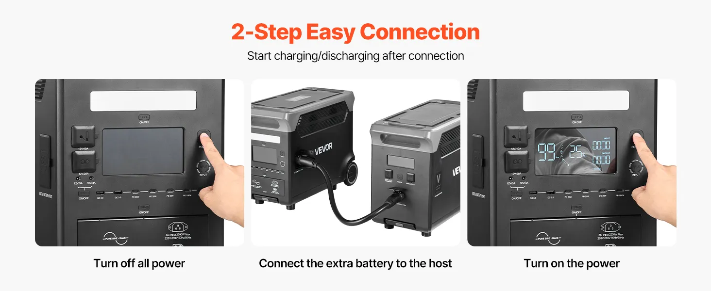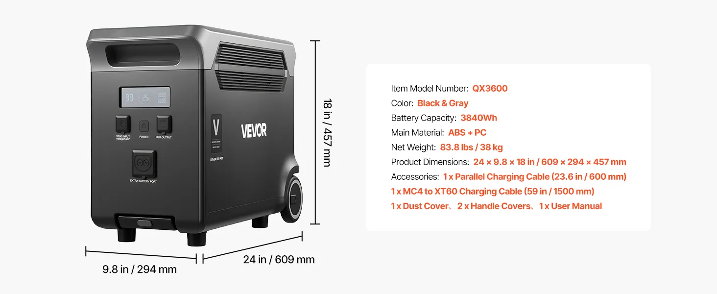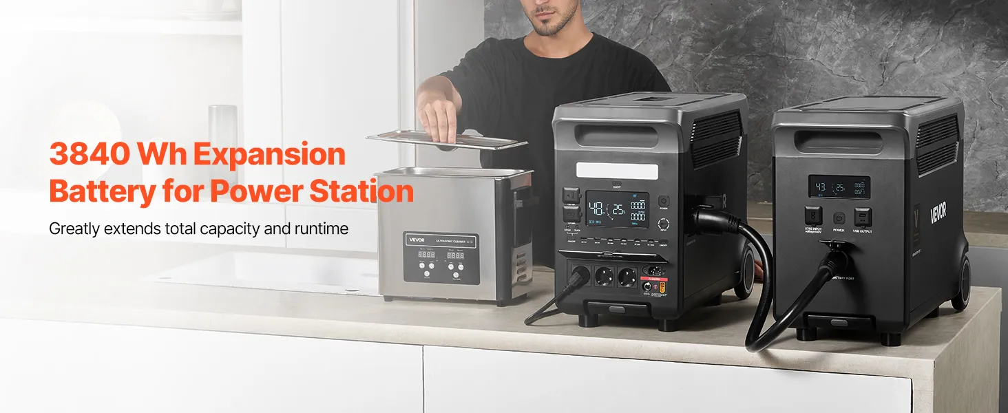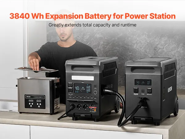 Zwiększ pojemność swojego magazynu energii: Akumulator pomocniczy VEVOR charakteryzuje się wysoką pojemnością 3840 Wh. Podłącz go do swojej elektrowni, aby zwiększyć pojemność i wydłużyć czas pracy. Pozwala to sprostać długiemu i wymagającemu zapotrzebowaniu na energię (kompatybilny tylko z jednostką główną o tej samej mocy znamionowej).