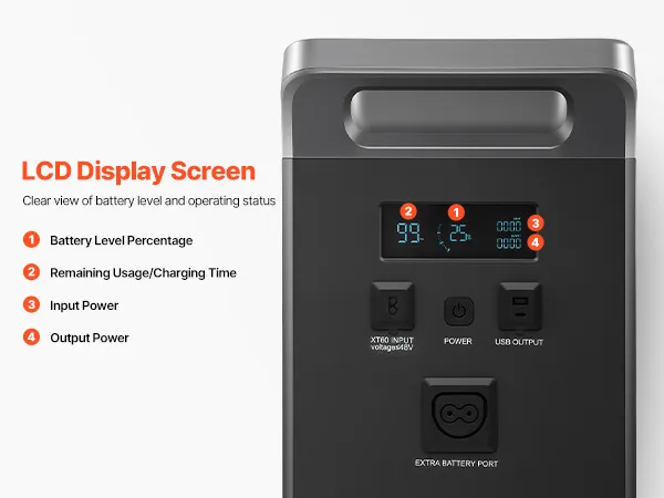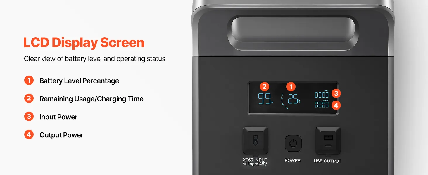 Czytelnie wyświetla procentowy poziom naładowania baterii, pozostały czas użytkowania/ładowania, moc wejściową i wyjściową, zapewniając bieżący stan działania urządzenia, co zwiększa bezpieczeństwo i łatwość użytkowania.