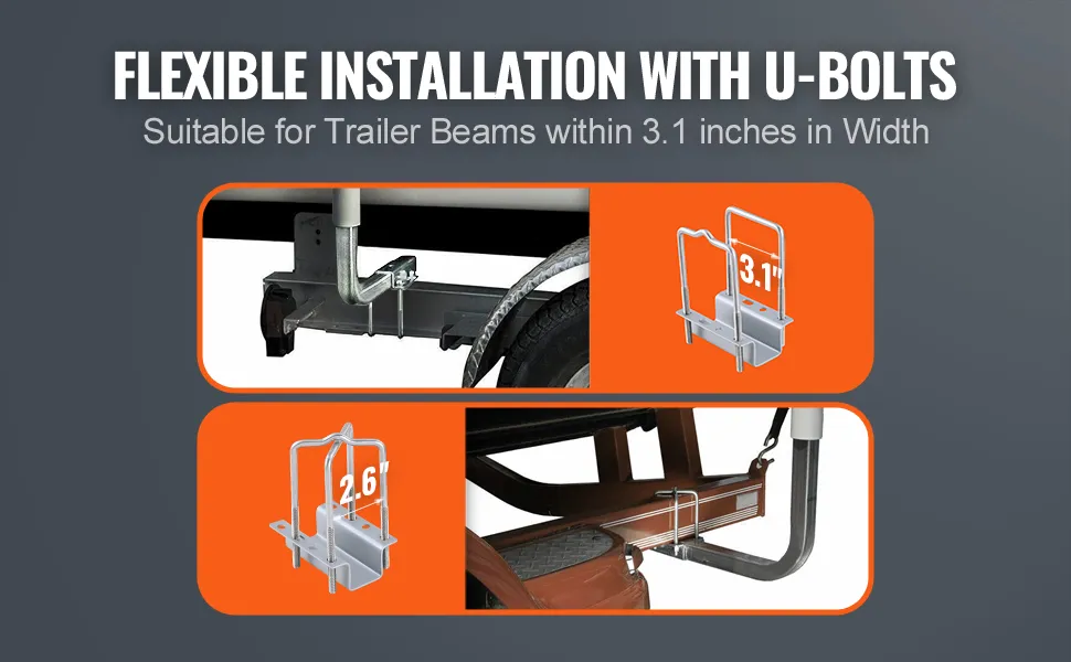 Ten przewodnik oferuje wiele opcji instalacji. Możesz użyć śrub w kształcie litery U do różnych modeli przyczep, w tym przyczep do łodzi narciarskich i przyczep do łodzi wędkarskich. Nawet mniejsze przyczepy ramowe można bezpiecznie zamontować. Ulepszona pogrubiona stal o wysokiej wytrzymałości na rozciąganie M8 zapewnia solidną instalację, dzięki czemu drążki prowadzące nie będą się łatwo przesuwać ani odkształcać. Elastyczność metod instalacji sprawia, że ten produkt nadaje się do różnych przewoźników łodzi, zapewniając niezawodne rozwiązanie dla potrzeb Twojej przyczepy i gwarantując bezpieczeństwo Twojej łodzi podczas załadunku i transportu.