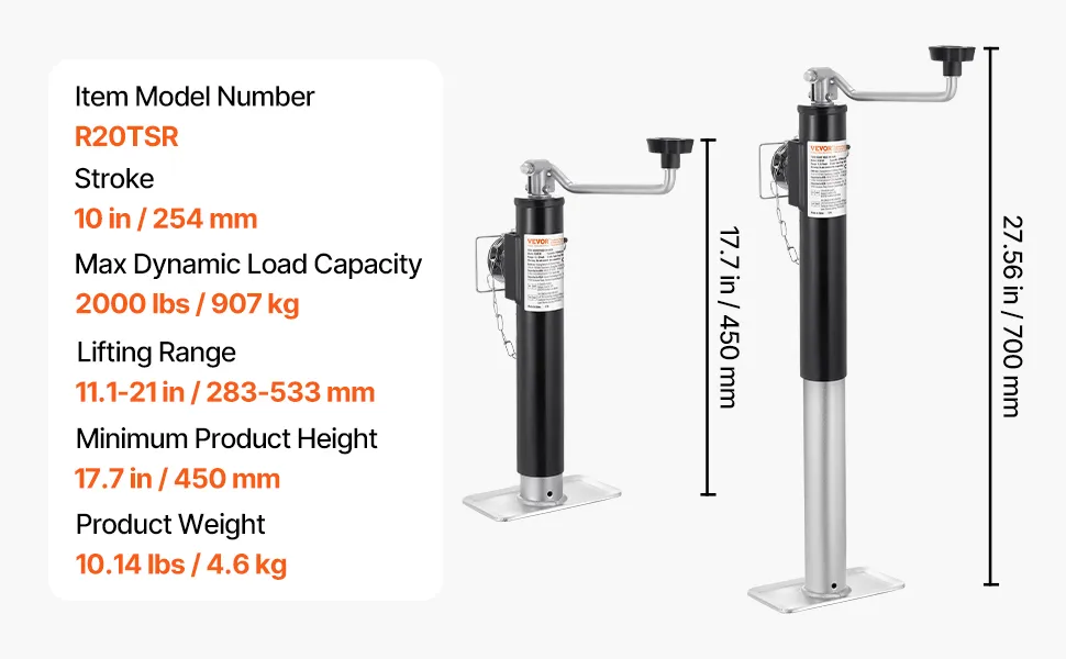 Wysoka nośność: Podnośnik przyczepowy charakteryzuje się imponującą nośnością 907 kg (2000 funtów), co czyni go potężnym narzędziem do podnoszenia. Dzięki zakresowi podnoszenia od 283 do 533 mm (11,1 do 21 cali) pasuje zarówno do przyczep o wysokim, jak i niskim profilu.