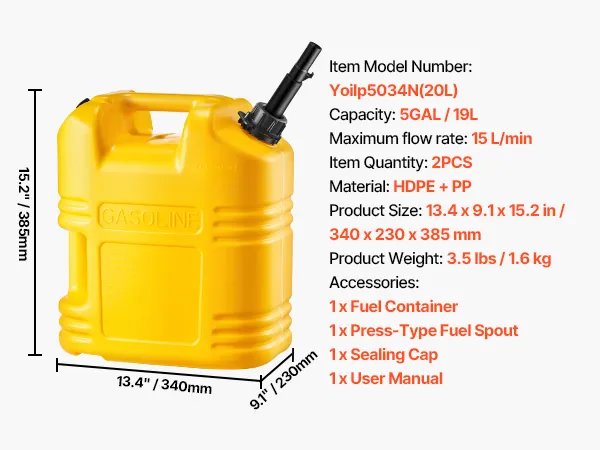 Kanister na paliwo VEVOR 2 sztuki, 19 l, kanister na paliwo z dzióbkiem i przezroczystą skalą, maks. przepływ 15 l/min, pojemnik na płyn do większości samochodów, motocykli, SUV-ów, quadów i pojazdów UTV, żółty