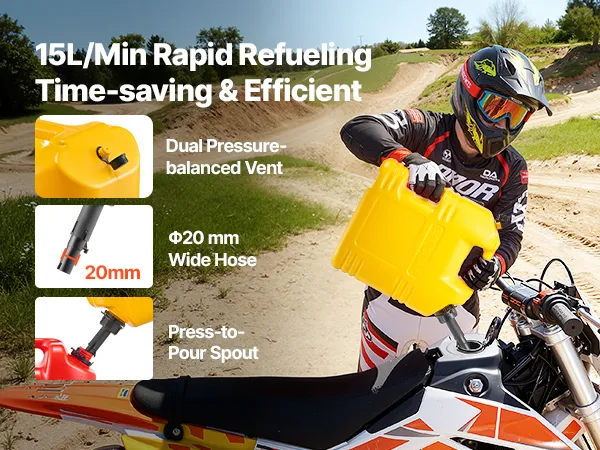 Płynny, szybki przepływ 15 l/min: Masz dość nierównego tankowania? Ten kanister z wężem o średnicy 20 mm i podwójnym zaworem odpowietrzającym umożliwia przepływ do 15 l/min, zapewniając płynny i stały przepływ przez cały czas.