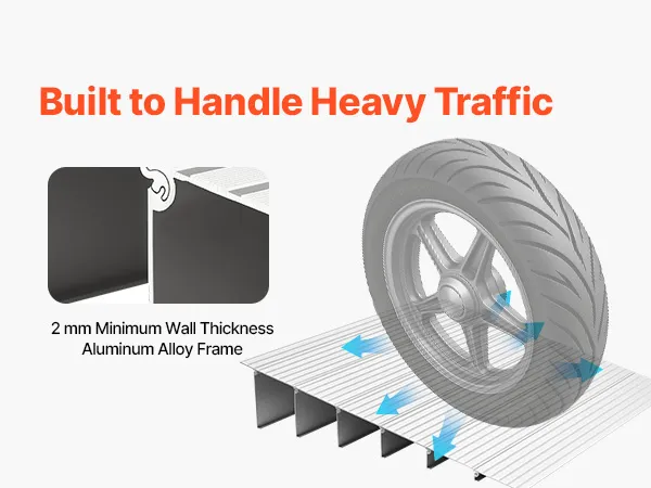 Wytrzymałość: Ta rampa progowa, wykonana z aluminium lotniczego 6063-T5 z solidnym rdzeniem o grubości 2 mm, wytrzymuje obciążenie do 360 kg. Pozostaje stabilna nawet pod ciężkimi wózkami inwalidzkimi, wózkami i sprzętem.
