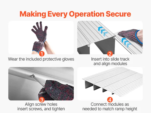 Bezpieczne i stabilne: Rampa przy drzwiach wejściowych jest bezpiecznie zablokowana za pomocą złączy śrubowych, co zapewnia stabilność połączenia i brak poślizgu. W zestawie znajdują się nawet rękawice ochronne, które ułatwiają i zabezpieczają montaż.