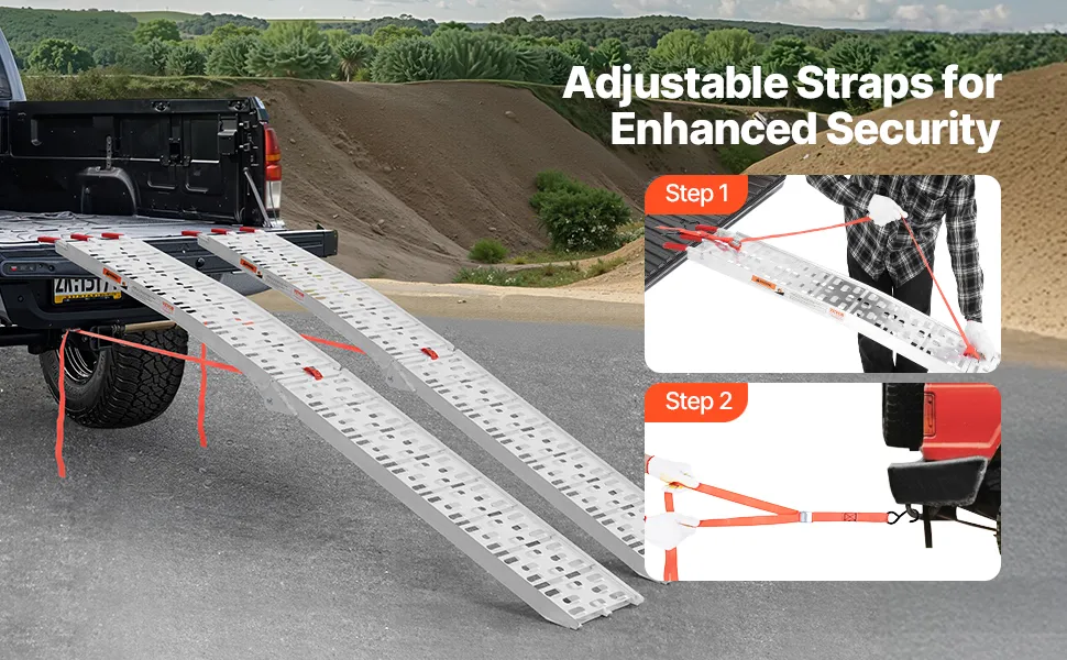 Wzmocniona paskami: Wyposażona w regulowane paski zabezpieczające rampa może być mocno przymocowana do krawędzi samochodu dostawczego, minimalizując ruch i zapobiegając poślizgowi lub przesuwaniu się podczas załadunku, zapewniając stabilny i bezpieczny transport pojazdu.