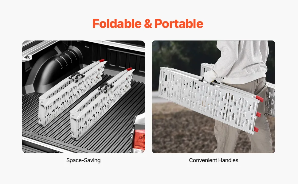Szybkie składanie: Rampę można złożyć i rozłożyć w ciągu 1 sekundy. Wzmocnione trójkątne połączenia zapewniają płynną pracę. Gumowy uchwyt ułatwia przenoszenie, a kompaktowa konstrukcja wygodnie mieści się w garażu lub bagażniku, nie zajmując dużo miejsca