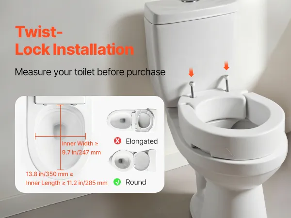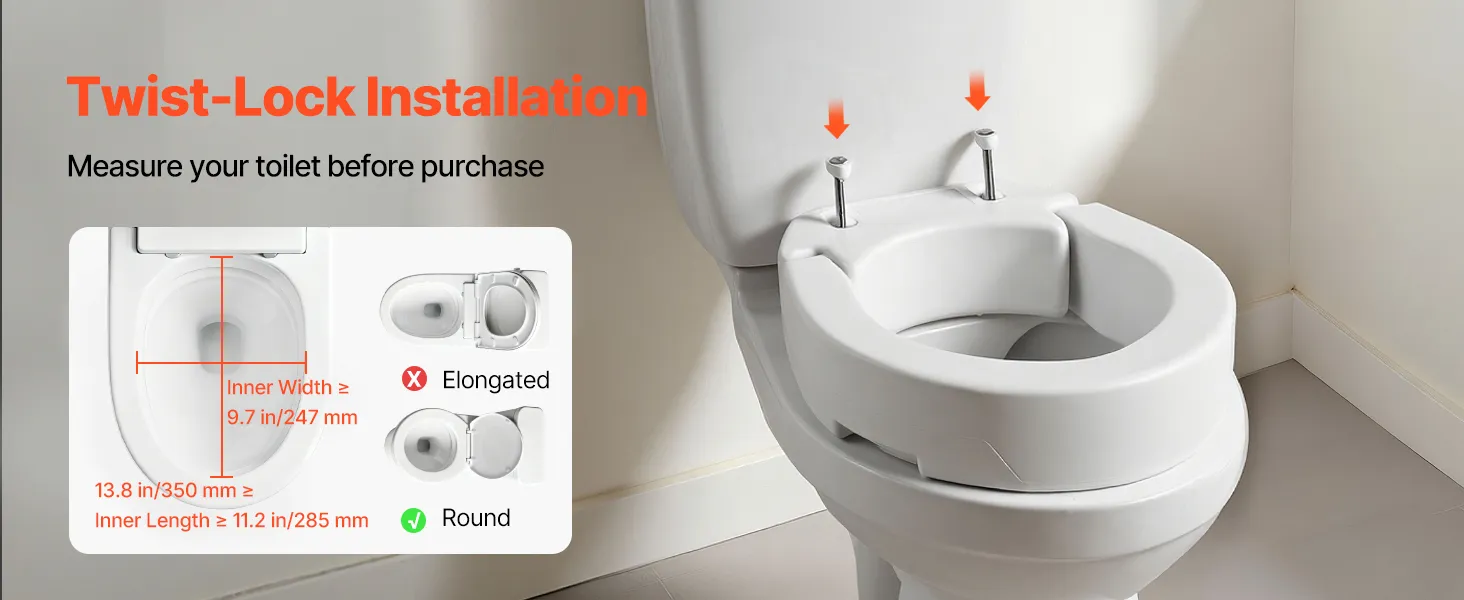 Montaż metodą Twist-lock: Nie wymaga wiercenia ani innych modyfikacji – wystarczy wyrównać otwory i przymocować śrubami. Ta podwyższona deska sedesowa pasuje do większości okrągłych toalet i zapewnia bezpieczne mocowanie.