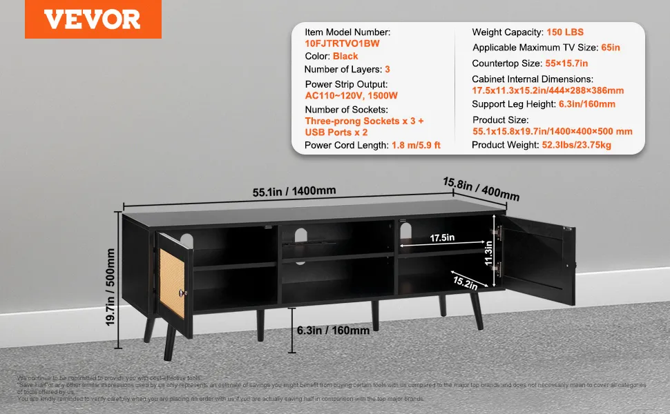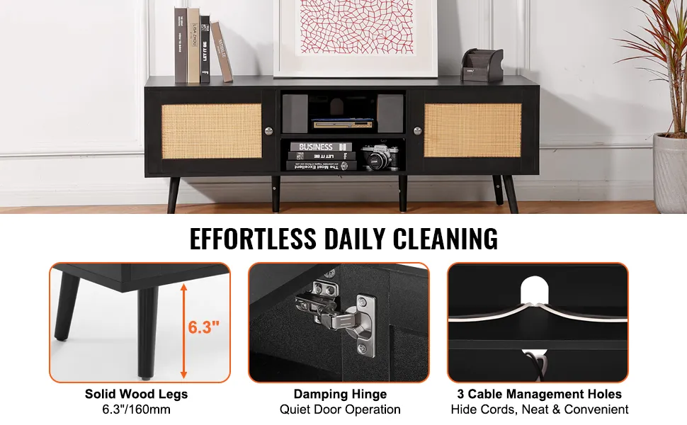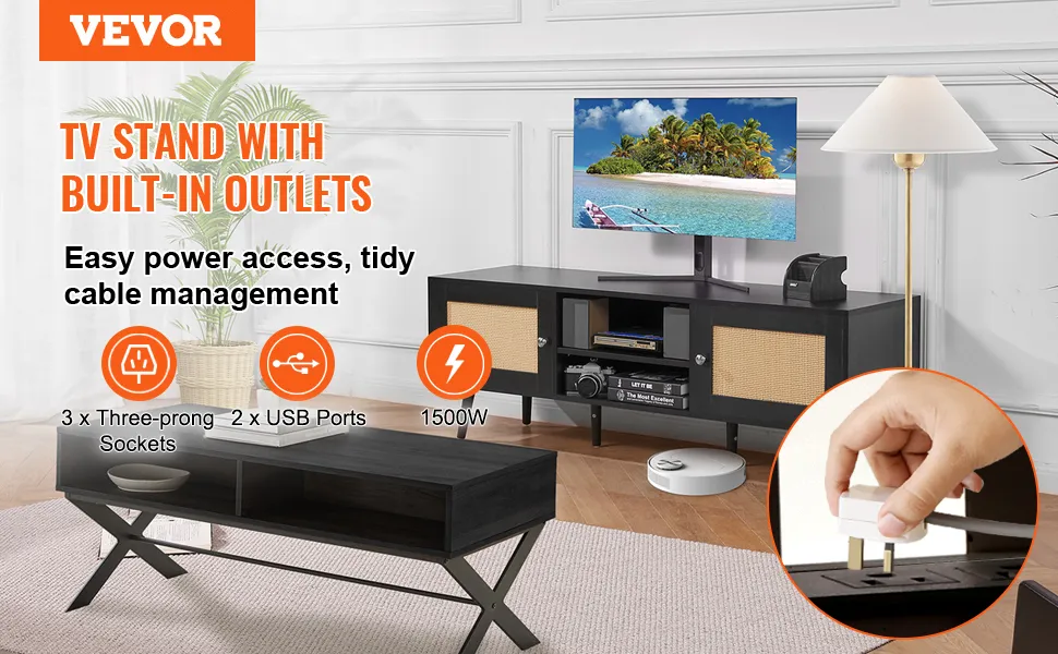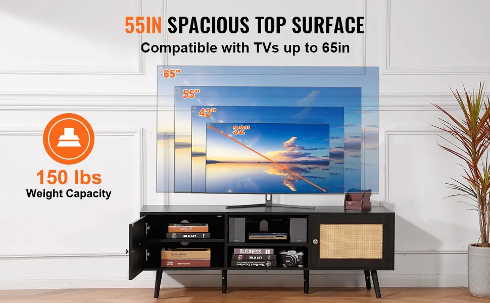 VEVOR Stojak pod telewizor z rattanu do telewizora 165 cm, Stojak pod telewizor w stylu boho z drzwiami z rattanu, Szafka pod telewizor z wbudowanym gniazdkiem elektrycznym i portami USB, Nowoczesna konsola pod telewizor do salonu, pokoju multimedialnego, Czarny