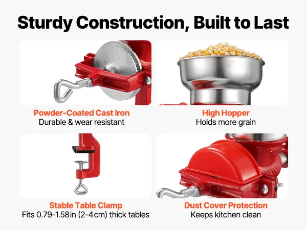 Stabilny zacisk stołowy: Ten młynek do kukurydzy bezpiecznie mocuje się do stołów o rozstawie 20–40 mm (0,79–1,58 cala), zapobiegając poślizgowi i zapewniając równomierne mielenie. Pokrowiec zapobiega rozpryskiwaniu się zmielonej kukurydzy i utrzymuje kuchnię w czystości.