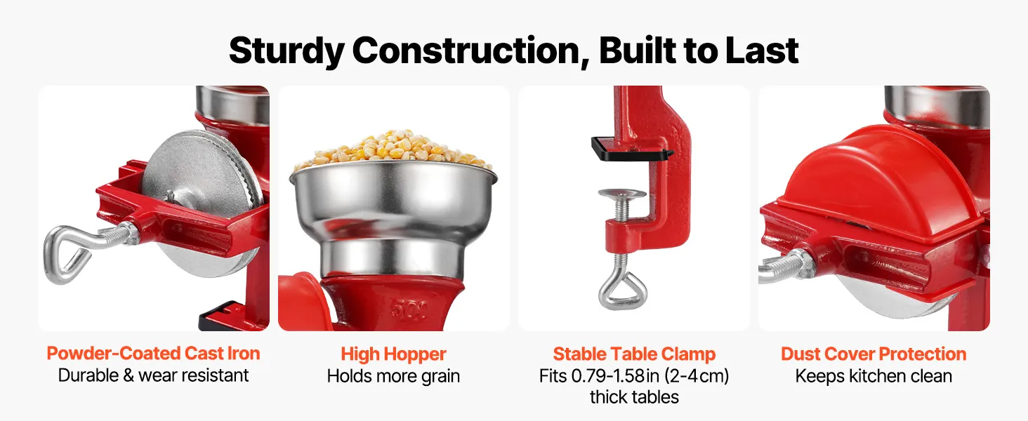 Ten młynek do kukurydzy wykonany jest z wysokiej jakości żeliwa z powłoką ochronną, dzięki czemu jest wyjątkowo odporny na rdzę i zużycie. Charakteryzuje się wyjątkowo długą żywotnością – idealną do intensywnego, codziennego użytkowania.