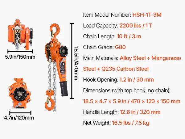 Wciągnik dźwigniowy VEVOR, udźwig 1 t, ręczny wciągnik łańcuchowy, udźwig 3 m, łańcuch ze stali stopowej G80 z mechanicznym hamulcem z podwójną zapadką, wciągnik zapadkowy z hakami obrotowymi 360°, wciągnik do magazynu, budowy, garażu