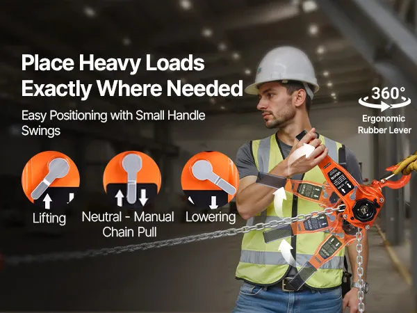 Łatwa obsługa: Nasz wciągnik łańcuchowy dźwigniowy wyposażony jest w ergonomiczny, obrotowy uchwyt 360° z antypoślizgową powierzchnią. Ciężkie ładunki można przenosić z minimalnym wysiłkiem, nawet w ciasnych przestrzeniach. Trójpozycyjny przełącznik umożliwia przełączanie między trybami podnoszenia, neutralnym i opuszczania.