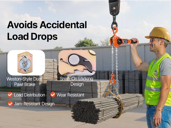 Bezpieczne i niezawodne hamowanie: Ten ręczny wciągnik łańcuchowy jest wyposażony w dwuzapadkowy hamulec Weston z przekładniami zapewniający precyzyjną kontrolę. Solidna konstrukcja zapobiega poślizgom i nagłym upadkom, równomiernie rozprowadza nacisk, zwiększa bezpieczeństwo i wydłuża żywotność.