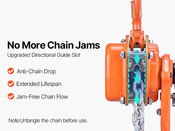 Płynna praca: Ten wciągnik łańcuchowy wyposażony jest w ulepszoną prowadnicę, która zapewnia płynne podnoszenie bez zacięć. Obrotowy hak 360° umożliwia bezpieczne użytkowanie pod różnymi kątami, zapobiegając skręcaniu i zwiększając wydajność w wymagających zastosowaniach dźwigowych.