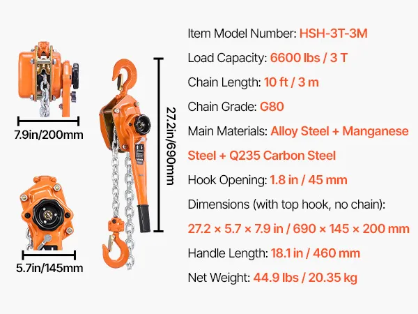 Wciągnik dźwigniowy VEVOR, udźwig 3 ton, wciągnik łańcuchowy ręczny, udźwig 3 m, wciągnik z łańcuchem ze stali stopowej G80 z mechanicznym hamulcem zapadkowym, haki obrotowe 360°, wciągnik zapadkowy do magazynów, budownictwa, garażu