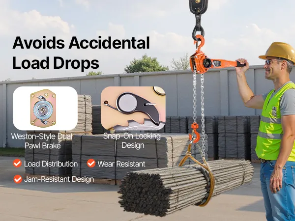 Bezpieczne i niezawodne hamowanie: Ten ręczny wciągnik łańcuchowy jest wyposażony w dwuzapadkowy hamulec Weston z przekładniami zapewniający precyzyjną kontrolę. Solidna konstrukcja zapobiega poślizgom i nagłym upadkom, równomiernie rozprowadza nacisk, zwiększa bezpieczeństwo i wydłuża żywotność.