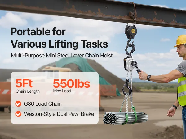 Ta ręczna wciągarka dźwigniowa z ocynkowanym łańcuchem G80 nadaje się do wymagających zadań, takich jak przenoszenie kłód, maszyn lub stalowych belek. Dwa hamulce zapadkowe typu Weston i szczelina na łańcuch zapewniają płynną i bezpieczną pracę.