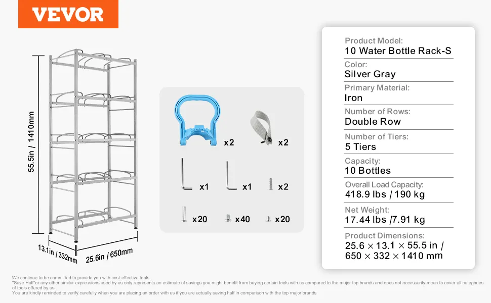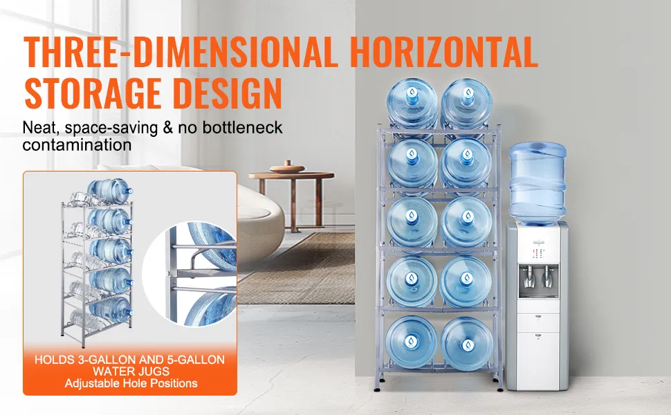 Regulowane otwory: Ten uchwyt na dzbanek na wodę ma wymiary 25,6 x 13,1 x 55,5 cala (650 x 332 x 1410 mm) i pomieści do 10 butelek o wadze do 418,9 funta (190 kg). Pasuje do butelek o pojemności 3 galonów i 5 galonów, zapewniając porządek w kompaktowej obudowie. Jego industrialny design pasuje do różnych stylów wystroju, dzięki czemu idealnie pasuje do każdego pomieszczenia.