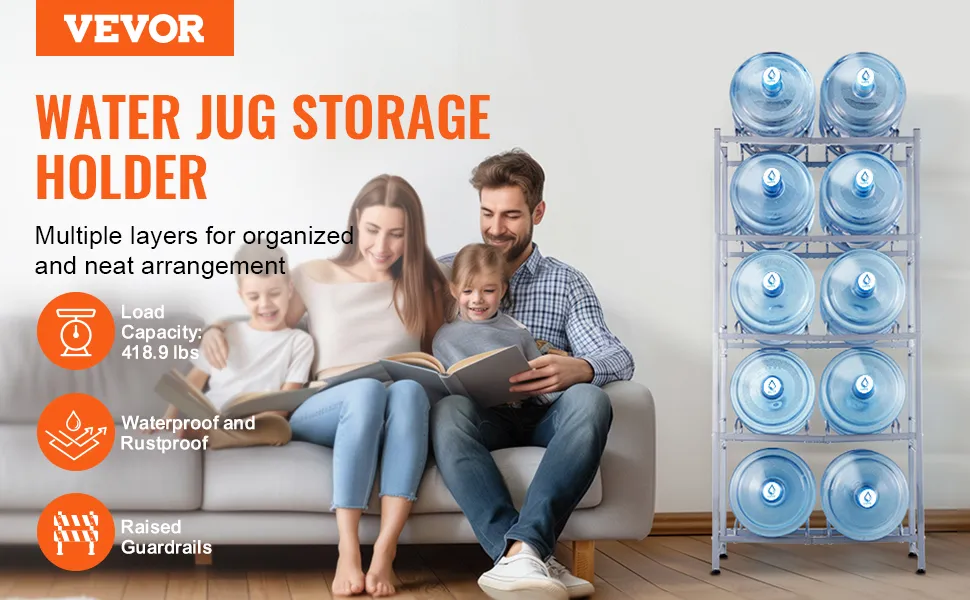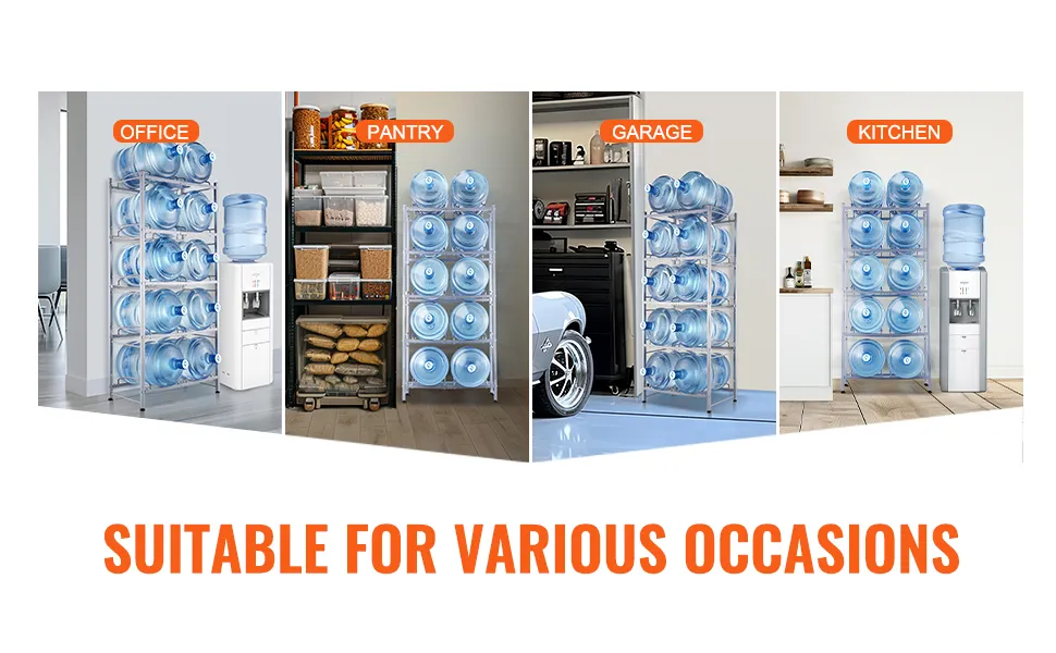 Stojak na dzbanki z wodą idealnie nadaje się do salonów, pomieszczeń gospodarczych, kuchni, garaży, spiżarni, garderób, pralni, siłowni i biur. Oferuje wydajne rozwiązanie do przechowywania wielu butelek.