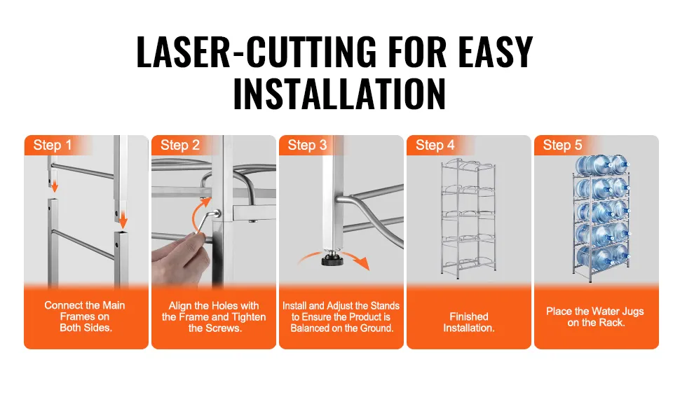 Łatwy montaż: Nasz stojak na dzbanki na wodę posiada otwory wycinane laserowo, co zapewnia precyzyjną i łatwą instalację. Stojak można montować na dowolnej liczbie poziomów. Do zestawu dołączona jest instrukcja szybkiego montażu.