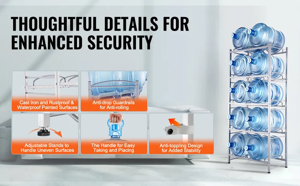 Wytrzymałe żeliwo: Ten stojak na butelki z wodą, wykonany z grubego żeliwa z powłoką proszkową, jest stylowy i niezwykle trwały. Jest odporny na korozję, rdzę i działanie wody, co zapewnia długą żywotność.